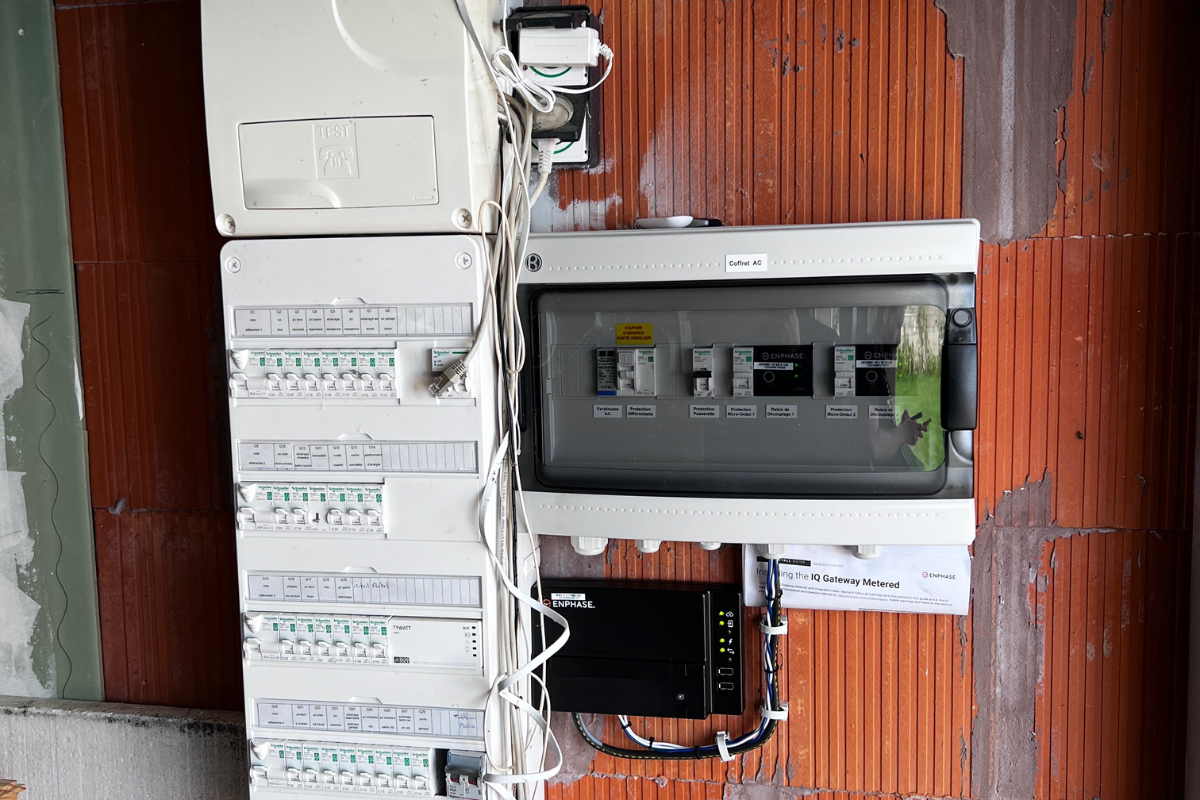 Les panneaux solaires ont été fixés sur la toiture après l’installation d’une structure adaptée. Chaque panneau est équipé d’un micro-onduleur individuel, fixé directement sous le module. Cette configuration permet une conversion instantanée du courant continu en courant alternatif et assure une production optimale, même en cas d’ombrage partiel.